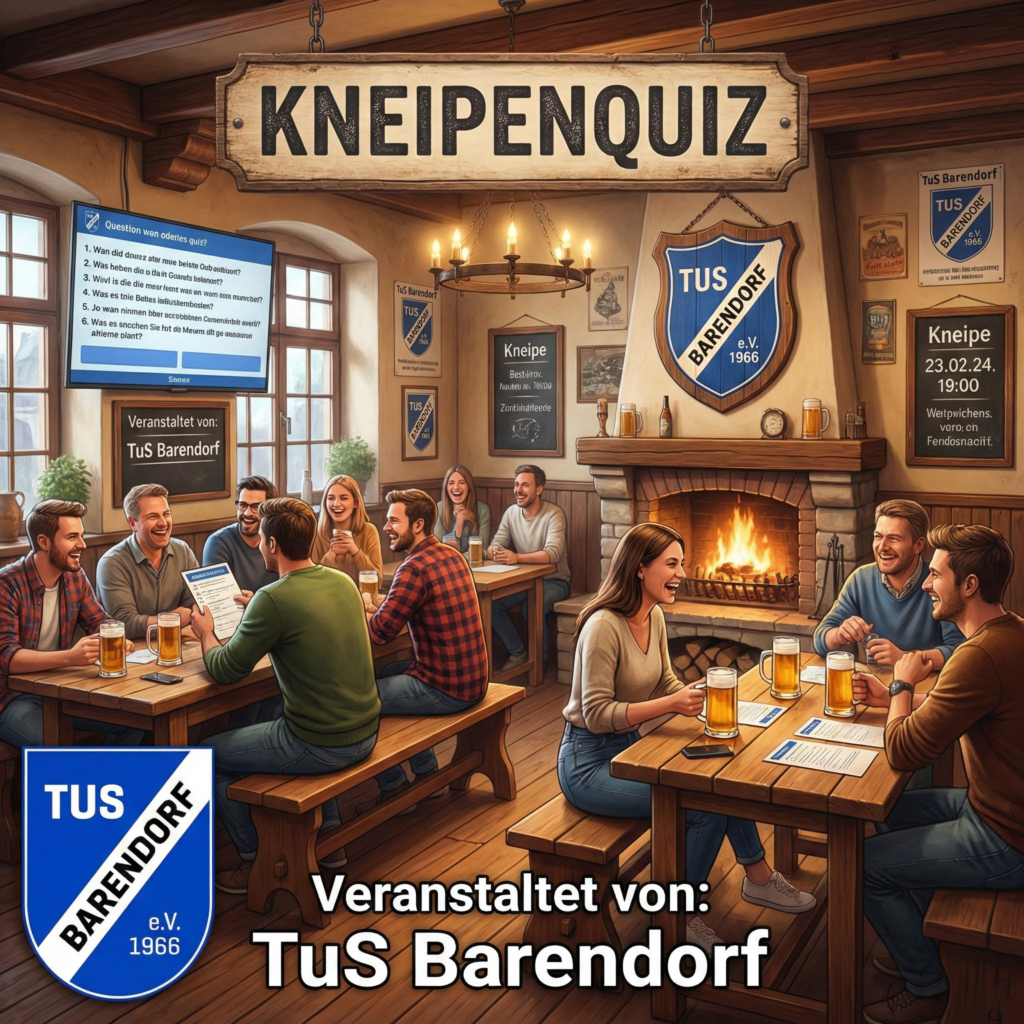 Das Kneipenquiz im Dorfgemeinschaftshaus verspricht einen unterhaltsamen Abend für Vereinsmitglieder, Freunde des Sports und alle Quizbegeisterten aus dem Dorf. In entspannter Atmosphäre treten Teams gegeneinander an und stellen ihr Wissen unter Beweis – ganz ohne Leistungsdruck, dafür mit umso mehr guter Laune.